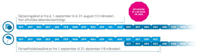 Ferieloven giver ret til 5 ugers ferie om året - det bliver der ikke ændret på. Det svarer til, at du opsparer 2,08 feriedage om måneden. Du kan stadig spare din ferie op, så du kan holde sammenhængende ferieuger. Og du har stadig ret til at holde tre ugers sammenhængende ferie hen over sommeren. Og hvis du har feriedage tilbage, når et nyt ferieår begynder den 1. september, har du også mulighed for at holde feriedagene fra det gamle år helt frem til den 31. december. Se figur.