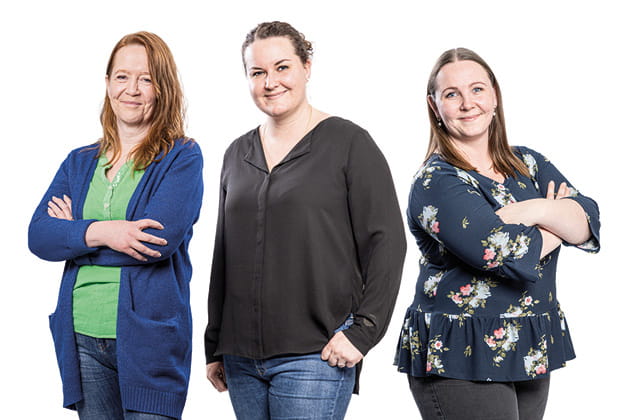 Heidi Steen Larsen (venstre) oplever, at hendes nye kompetencer øger arbejdsglæden. Trine Jensen (højre) og Anitta Østergaard (midt) er blevet mere bevidste om, hvordan forskellige mennesketyper lærer, og det hjælper dem i vejledning af elever og studerende. Foto: Michael Drost-Hansen