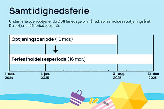 På et ferieår (1. september til 31. august året efter) optjener du 25 feriedage (5 uger). De skal som udgangspunkt bruges i ferieafholdelsesperioden (1. september til 31. december året efter).