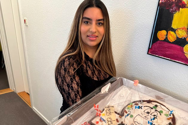 Lina Ahmed med kagen, som skal deles med kollegaerne.
