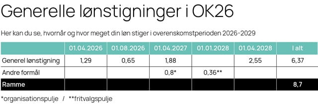 Stigningen på 6,37 procent gælder alle faste løndele og svarer til, at en løn på 30.000 stiger med 1.911 kroner om måneden, mens en løn på 40.000 stiger til 42.548 kroner, når aftalen er fuldt indfaset.