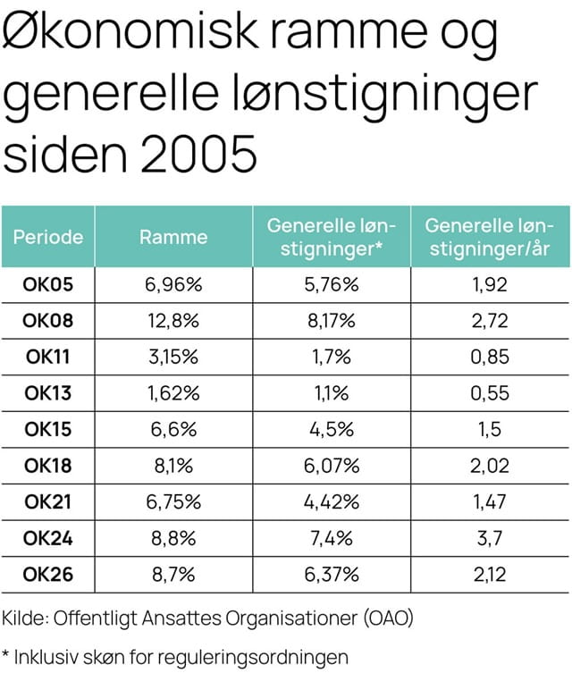 Denne gang falder lønstigningerne med 1,94 procent i år, 1,88 procent i 2027 og 2,55 procent i 2028. Det er også aftalt at videreføre reguleringsordningen, der skal sikre, at lønnen i det offentlige følger den private løn.