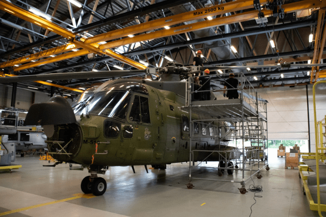 En EH101 Merlin helikopter til eftersyn på Hovedværksted Aalborg. De senere år er sikkerheden og kontrollen med adgang til både staten og private leverandører øget, og det har fået ventetiderne på sikkerhedsgodkendelser til at stige. Arkivfoto: Sofie Bock Troelsen/Forsvarsgalleriet.